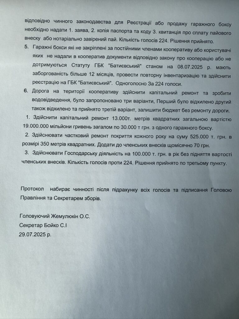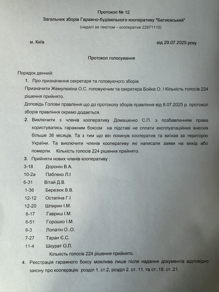 Протокол №12 зборів правління ГБК “Батиєвський” від 29.07.2025 року